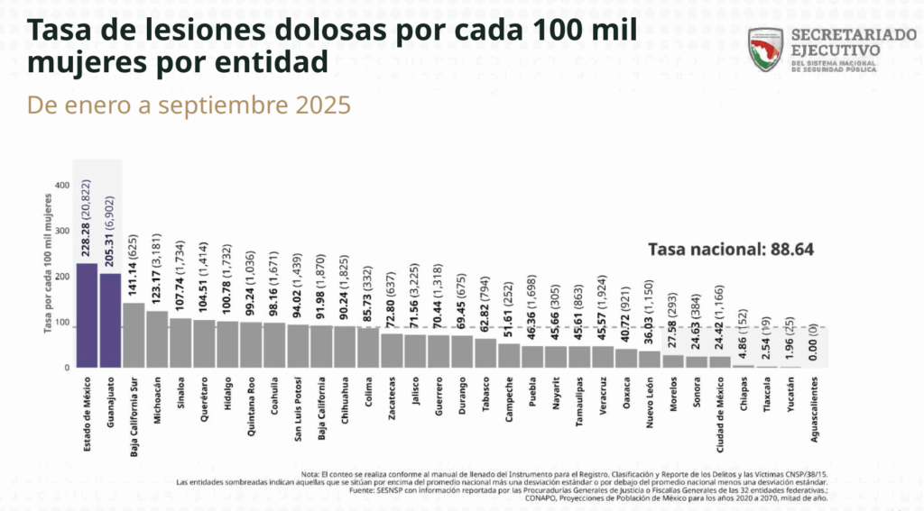 Esta tasa coloca a la entidad en la sexta posición de entre los estados con mayor incidencia de lesiones dolosas contra las mujeres.