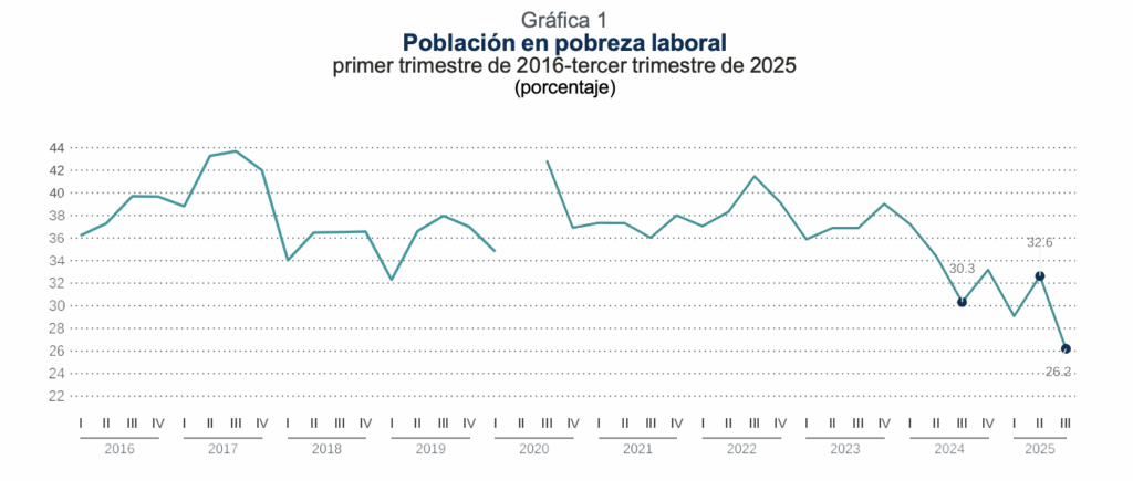 Entre el tercer trimestre de 2024 y el tercer trimestre de 2025, la pobreza laboral disminuyó 4.1 puntos porcentuales: pasó de 30.3 a 26.2%.