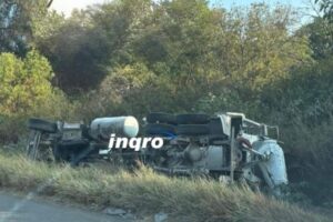 Esta mañana, una revolvedora, protagonizó una salida de camino y volcadura, sobre el libramiento Norponiente, el cual dejó solo daños materiales .