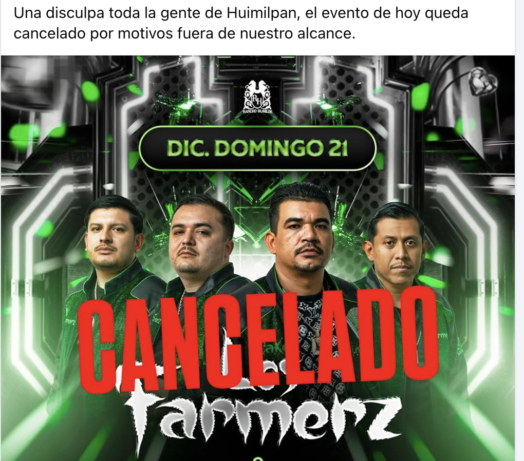 En tanto, la presentación que Los Farmerz tenían programada para este domingo en la Feria Ganadera Huimilpan 2025 fue suspendida. A través de sus redes sociales, la agrupación confirmó la cancelación del concierto.