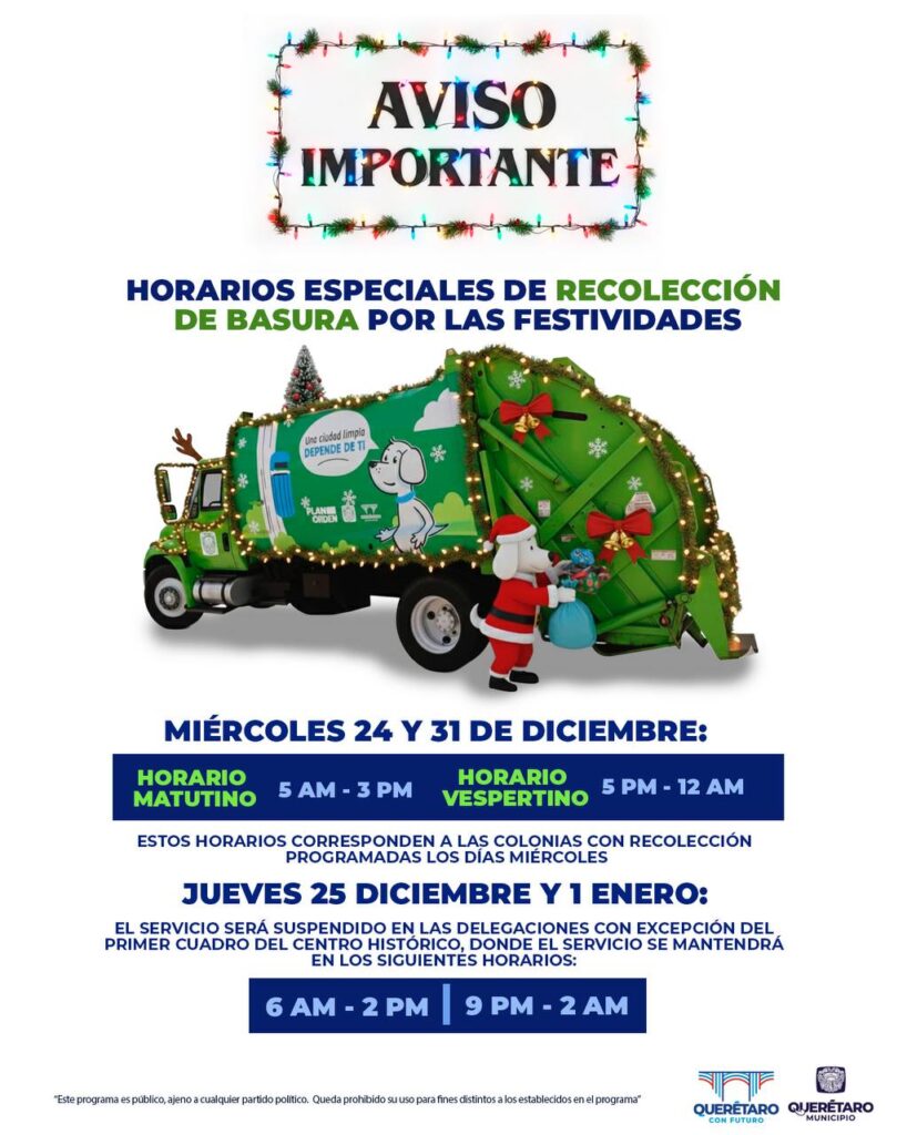 La Secretaría de Servicios Públicos Municipales de Querétaro informó que, con motivo de las fiestas decembrinas, se aplicarán ajustes temporales en los horarios de recolección de basura.