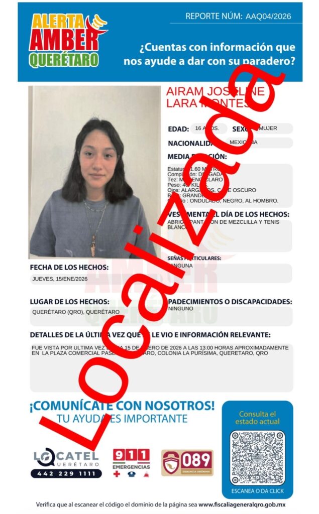 La fiscalía General del Estado de Querétaro, ha desactivado una de las alerta Amber, en las cuales se solicitó el apoyo para la localización, de cuatro menores de edad, que estaban, reportadas, como no localizadas.