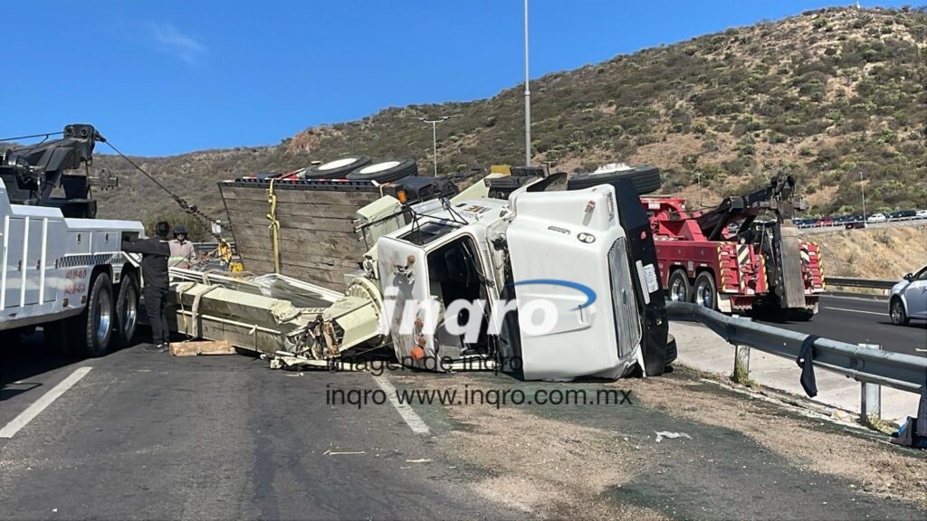 El operador de un tráiler, resultó lesionado, luego de una aparatosa volcadura de un tráiler, que se registró la tarde de este viernes, en el anillo vial Fray Junípero Serra.