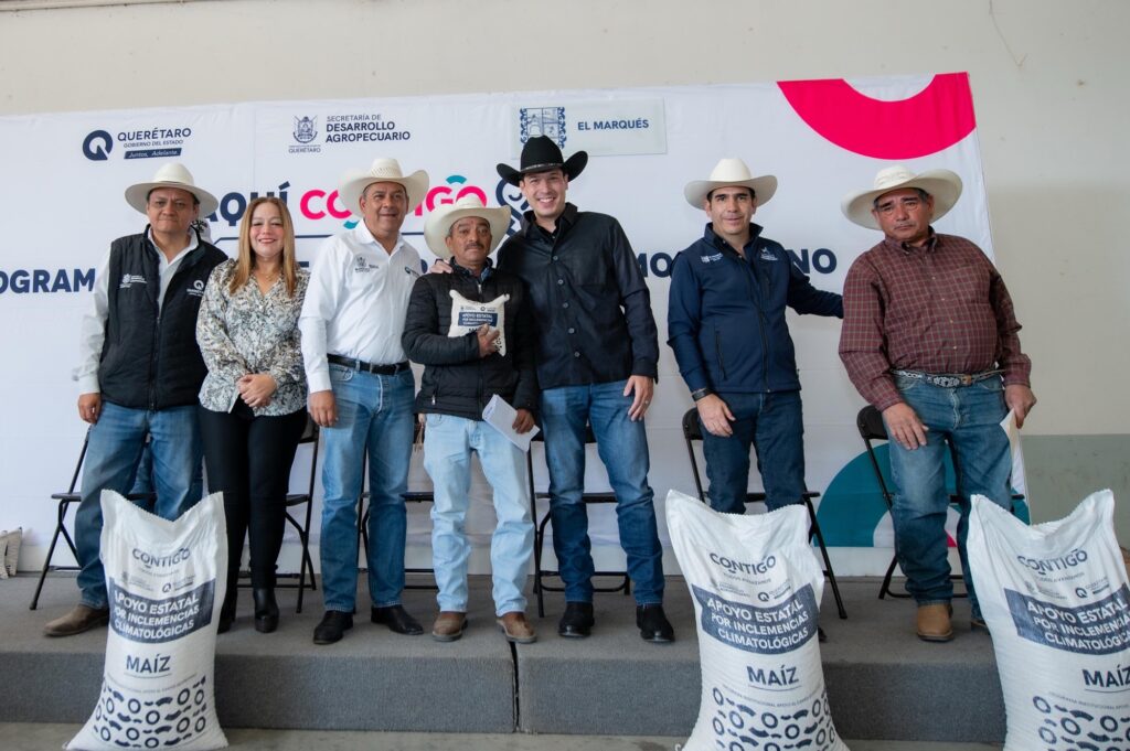 El presidente municipal de El Marqués, Rodrigo Monsalvo Castelán, junto con el secretario de Desarrollo Agropecuario (SEDEA) del estado de Querétaro, Rosendo Anaya Aguilar, encabezaron la entrega de 479 toneladas de grano de maíz para consumo humano a productores locales durante 2025 por el cambio climático.