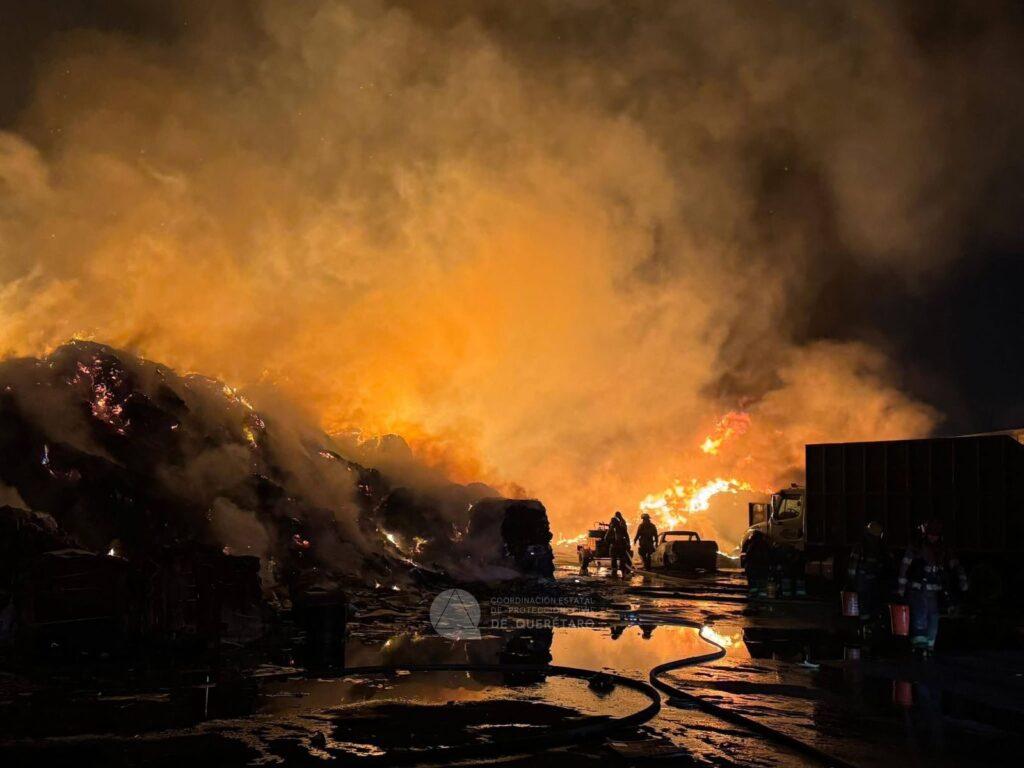 Fue a la altura de Buenavista, en Santa Rosa Jáuregui, en donde se registró el incendio de la recicladora, la cual quedó en pérdida total, por el voraz incendio.