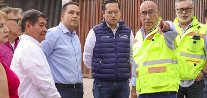 El presidente municipal de Corregidora, Chepe Guerrero, junto con el titular de la Secretaría de Gobierno en el Estado, Eric Gudiño; el secretario de Desarrollo Urbano y Obras Públicas en la entidad, Pio X...