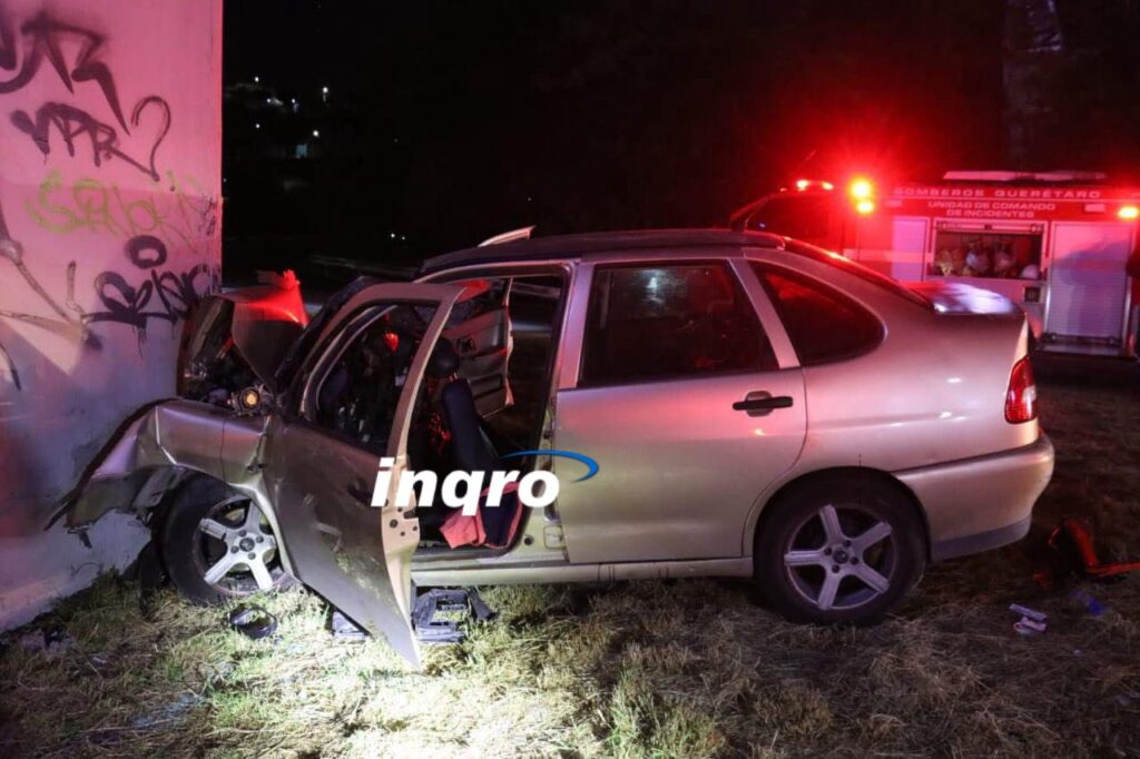 Al perder el control, el auto se impactó contra la base del puente vehicular, lo que ocasionó que el auto quedara con severos daños materiales y las personas a bordo heridas.